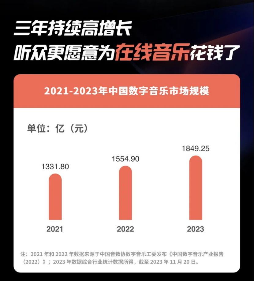 据《2023腾讯娱乐白皮书·音乐篇》数据显示,2021-2023年中国数字音乐市场规模逐年递增,分别为1331.80亿元、1554.90亿元和1849.25亿元,三年持续增长的数据说明听众更愿意为在线音乐花钱了。