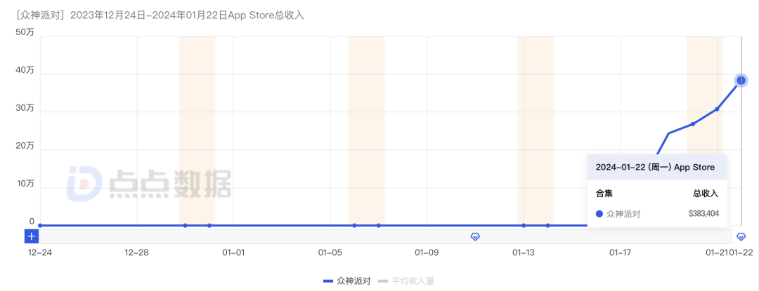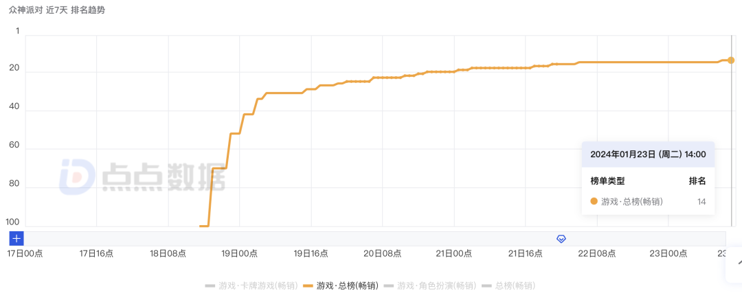 点点数据显示,《众神派对》上线当天位居iOS游戏免费榜第18名,iOS畅销榜首日仅排名第100名。但之后,《众神派对》排名不断提升,截止至1月23日,其排名已经来到了第14名的位置。