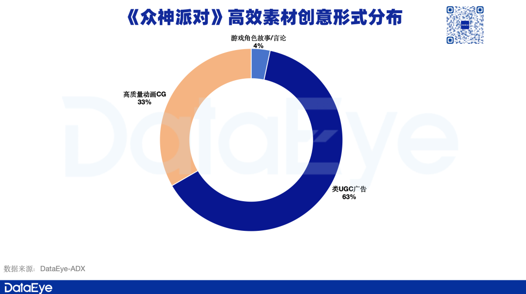 DataEye研究院整理了《众神派对》投放计划数TOP30的高效素材,其投放素材创意形式中,类UGC短片和高质量动作CG占比较高,前者占比约为63%,后者占比约为33%。