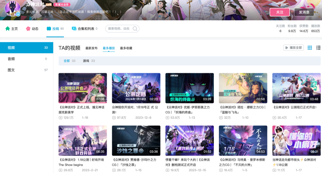 在长视频平台,主要是官方账号在B站运营,发布游戏角色新PV,相关视频最高有接近130万的播放量。