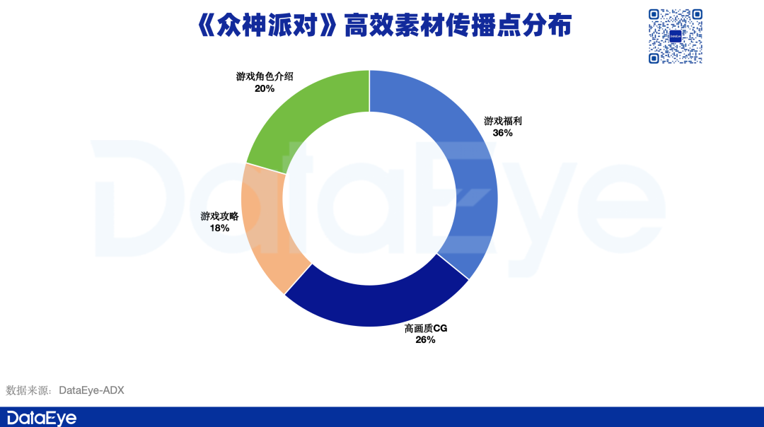 素材卖点方面,约为36%的素材是传递游戏福利内容,同时26%的比例是以高质量CG动画为宣传点。