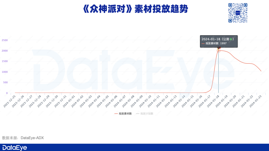 《众神派对》在上线当天进行较高数量的素材投放后,其投放量便呈直线下滑的状态。