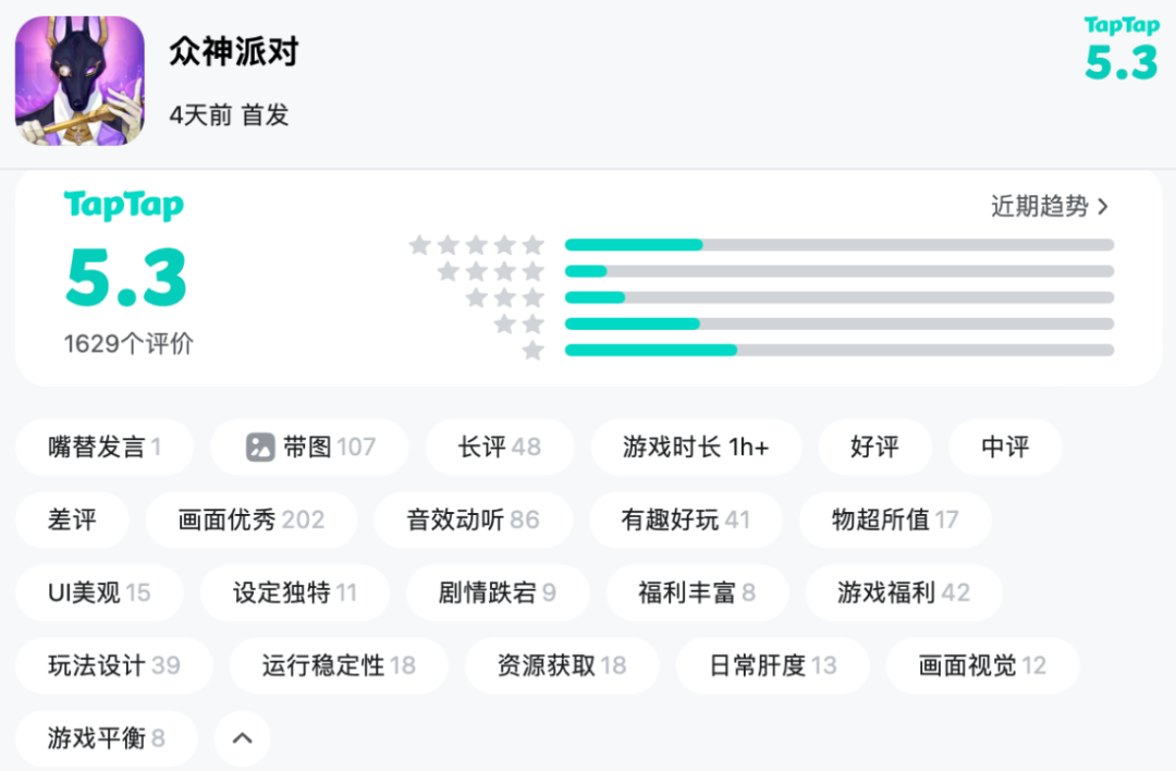 不仅如此,游戏出色的视听表现和3D场景中的动画,为产品提供了足够的品质感支撑和高辨识度。从TapTap玩家评论中,《众神派对》在美术、音乐方面对玩家的吸引力。