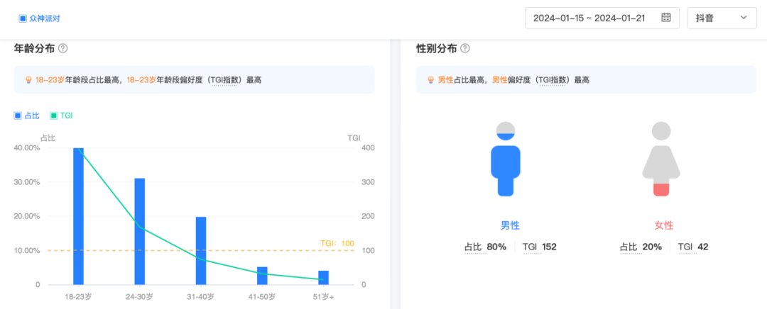 巨量算数统计,《众神派对》的用户年龄分布中,18-23岁区间占比较多,达到近40%。同时,24-30岁区间的用户占比也超过30%。