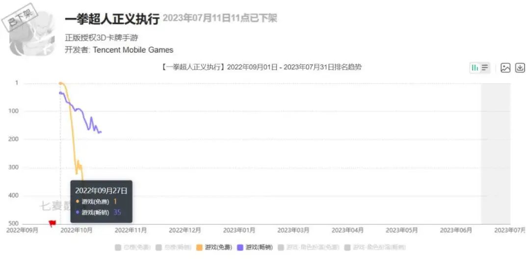 腾讯的《一拳超人正义执行》背靠近些年大火的《一拳超人》IP,但回合制卡牌的玩法无甚新意,IP光环也没能掩盖玩法同质化的问题,游戏在上线一个月后就滑落至200名以外了。