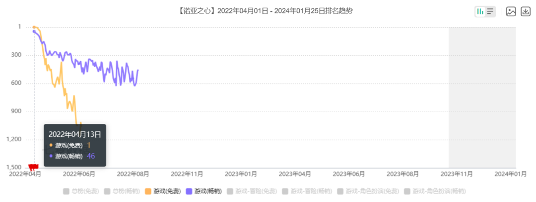 其中不乏一些大厂曾经非常看重的项目,比如腾讯的《诺亚之心》。这款游戏由祖龙研发,前后和电影、电视剧、游戏等多个IP开展联动活动,也数次与多个歌手、声优、明星艺人甚至是职业运动员跨界合作。但游戏仅在上线第一天达到iOS畅销榜46名,随后就在一个月内迅速滑落至200名以外,颓势一发不可收拾。国际服的成绩也同样不好。