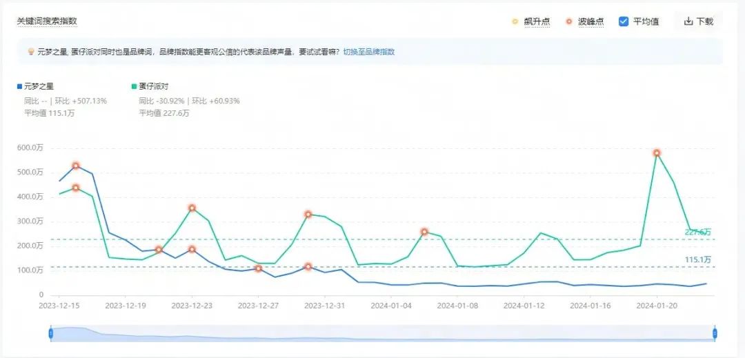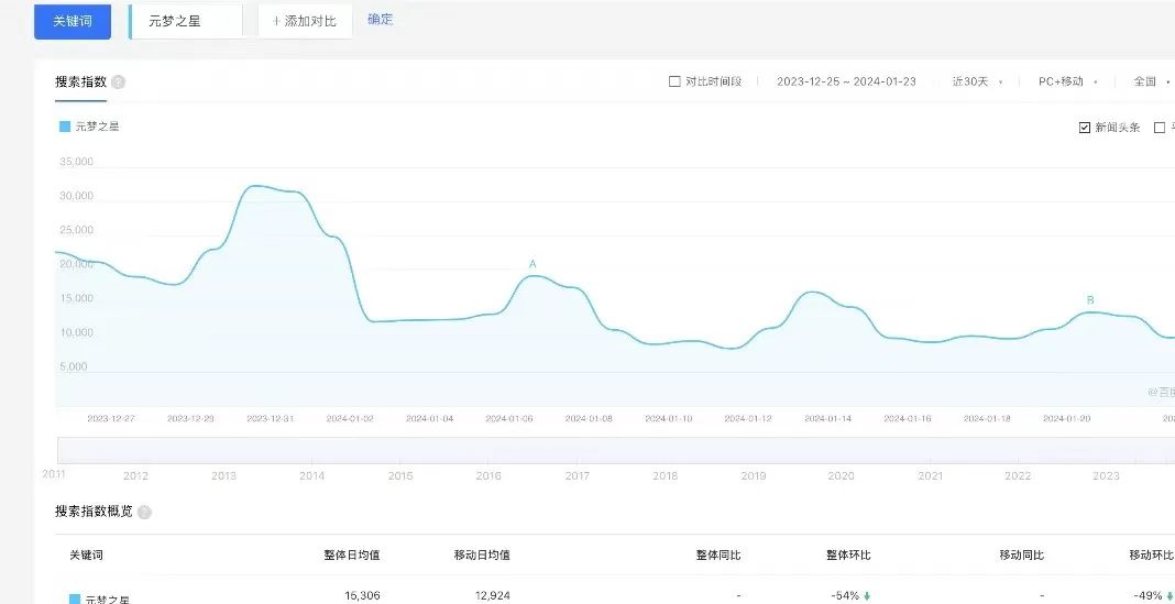 同样,从百度指数上来看,截止1月23日,“元梦之星”相关搜索量逐步下滑,讨论热度消 退。