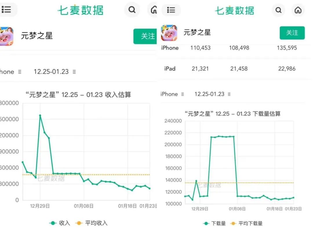 上线初期,《元梦之星》靠大笔投入换得不错成绩。据点点数据显示,iOS 端流水方面,12月15日至1月15日期间《元梦之星》总收入为1.38 亿元,在诸多新游中遥遥领先;而在iOS端,《元梦之星》和《蛋仔派对》近一个月的下载量均为660万左右,可以说不相上下。