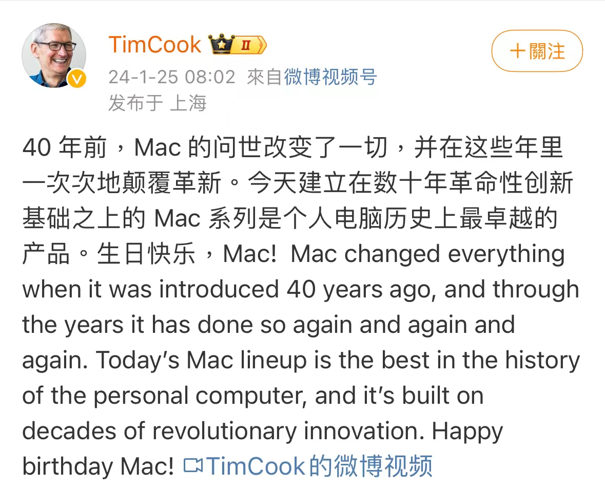 今日,现任苹果公司CEO蒂姆·库克在社交媒体上分享了庆祝Mac 40周年的消息,与所有「麦金塔粉丝」共同感受这份喜悦。