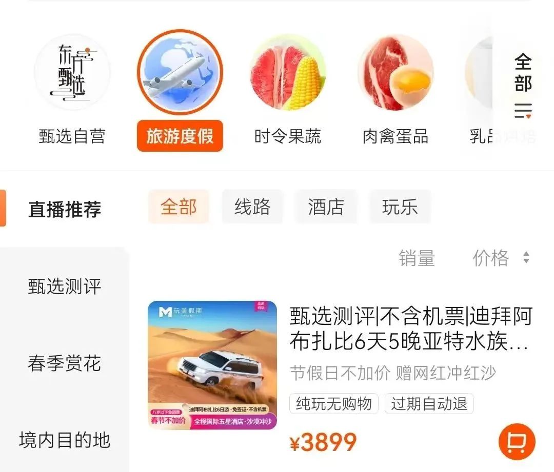 更关键的要素在于,在直播带货和教育两大板块之外,文旅业务带来了更广阔的想象空间。打开东方甄选APP,文旅分类紧跟东方甄选自营窗口,“山河宝藏”“看世界”等公号也在直播平台的重要位置,通过境内、境外游,酒店服务,门票玩乐等9类提供服务,使用流程类似携程集团-S、同程旅行、途牛等OTA(Online Travel Agency,在线旅游)平台。