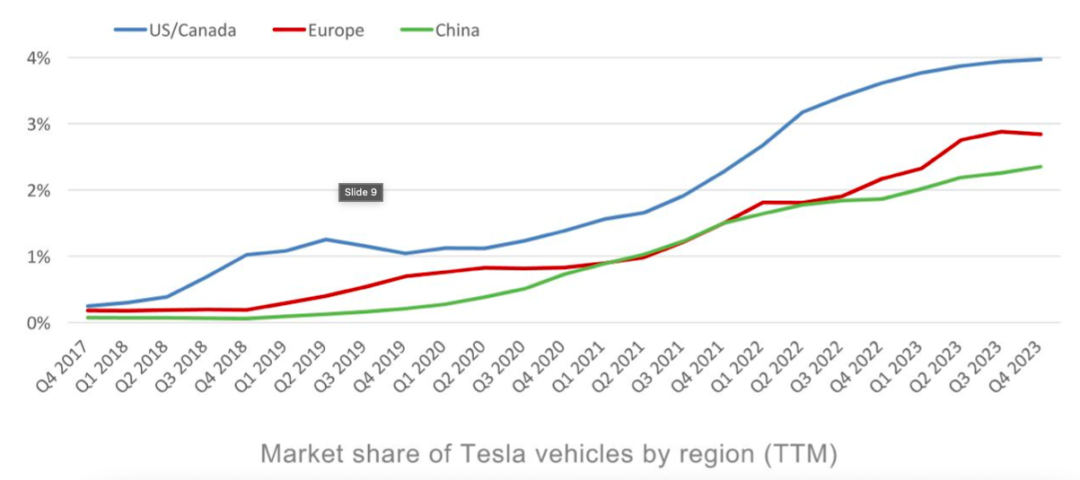 与此同时,随着福特、通用等传统车企的电动化转型加速,特斯拉在美国本土的主导地位也正在被逐步消解。根据Cox Automotive统计,2023年美国纯电动车的总销量规模为120万辆左右,而特斯拉的市场份额为55%,同比下降10个百分点,其中,2023年Q4,这一数据进一步降至51%。