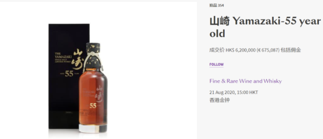 日威也因此变成具有礼品流通和金融属性的藏品。比如2020年,Bonhams的香港拍卖会上,一瓶山崎55年以港币620万元(约合人民币555万元)成交,创单瓶日本威士忌的历史新高。