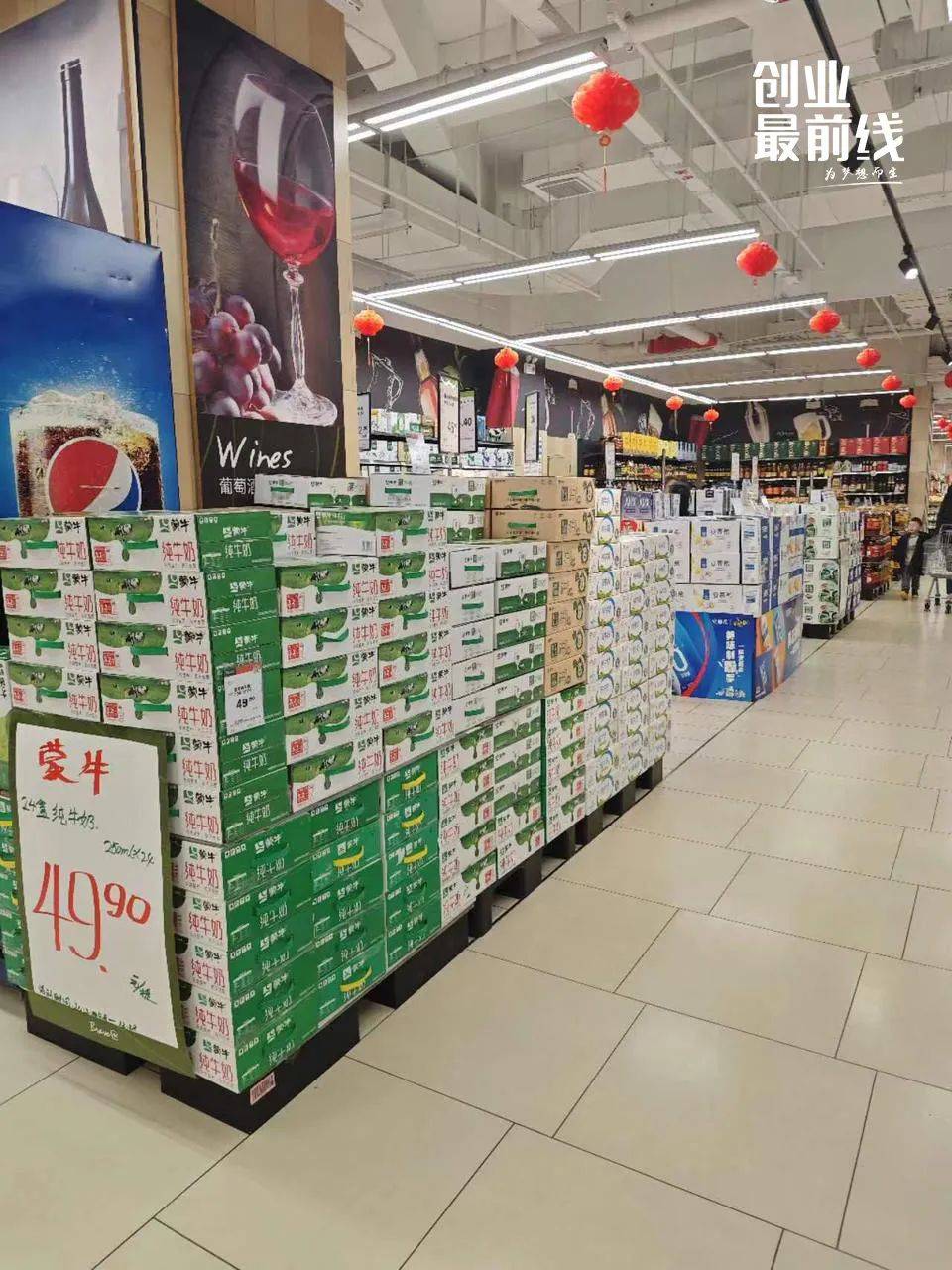 在纯牛奶的促销区里,原价59元单箱规格为227ml*16盒的三元利乐枕纯牛奶,在线下打出35.9元/箱的促销价;隔壁的蒙牛将原价55.4元单箱规格为250ml*24盒的纯牛奶打出49.9元/箱的价格与其正面交锋。