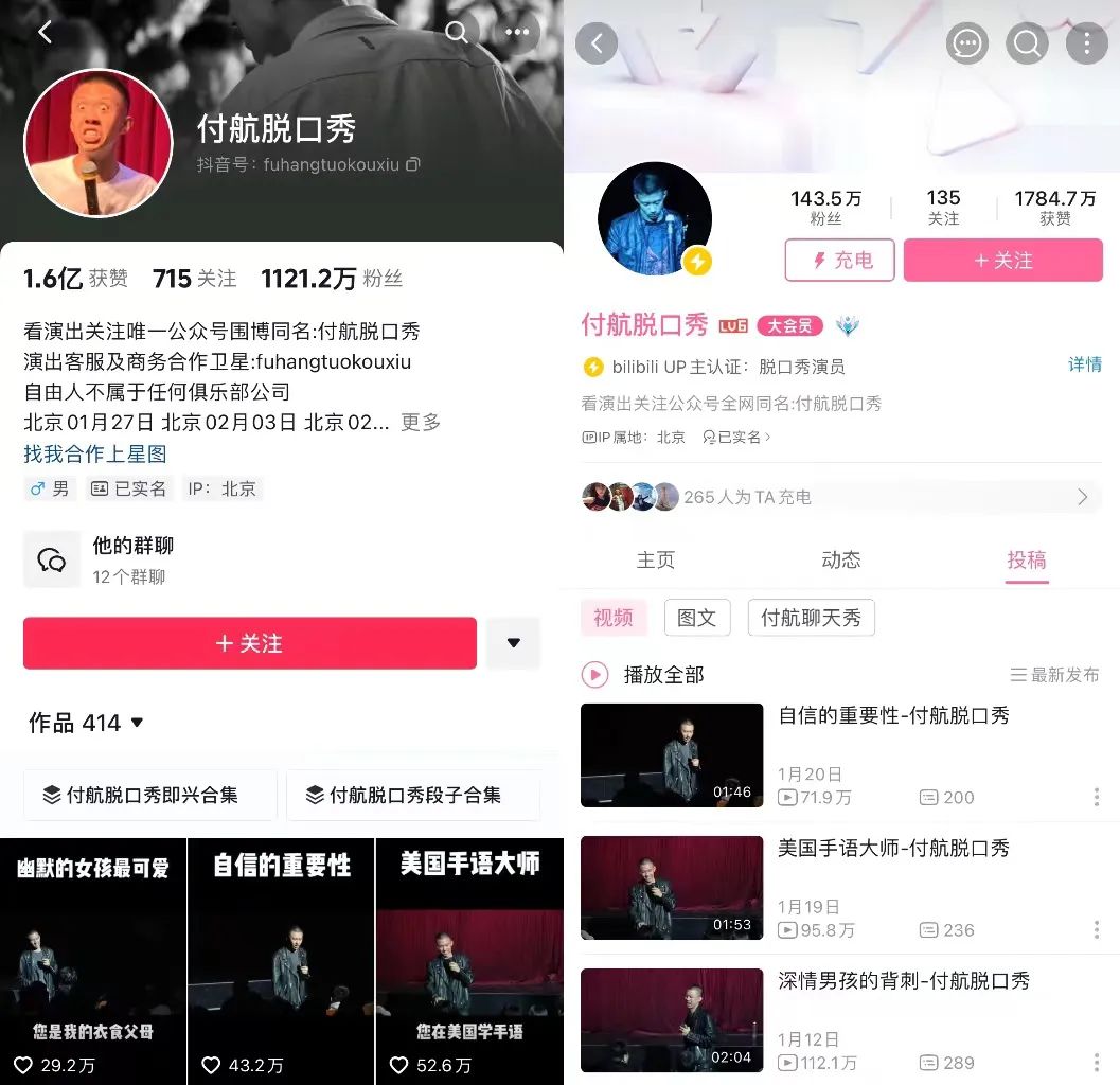 付航、Norah等人是最早一批借助短视频优势起来的演员,其中,付航抖音1120万粉丝,B站143.2万粉丝,切片视频基本保持在50-100万的播放量。