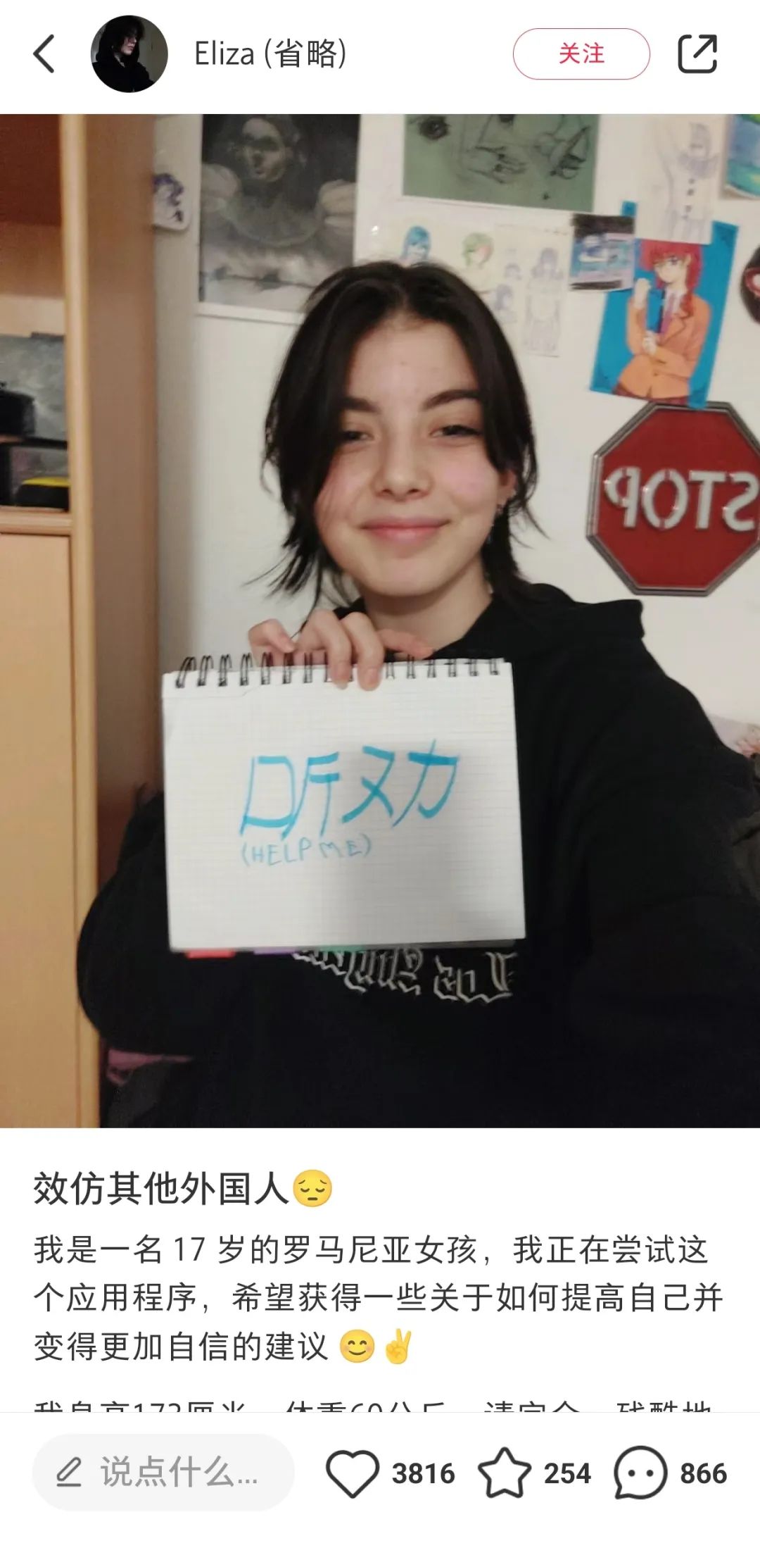比如,一名罗马利亚女孩Eliza于1月26日在小红书上发布了一张举着写有「听劝」白纸的照片,直言自己想要更自信,也请小红书网友们给出「直接、残酷、诚实」的评价,收获几百条评论,且数量还在不断增加。