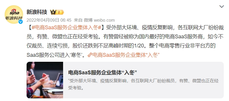 互联网行业红利在消退,而微盟所在的SaaS(软件即服务,一般指软件运营服务)行业也感受到了压力。前不久的一场论坛上,企业支出管理平台“分贝通”创始人兰希就表示,2023年对95%以上的SaaS公司来说都十分艰难。