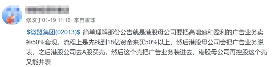 也有投资者认为,这是微盟未来实现A+H上市的必经之路,其会先将营销业务脱表,待到该部分业务借壳A股上市成功后再重新控股、并表。营销业务36亿元的估值,对比公告发布当天微盟57亿元的市值,以及该业务在收入中的占比,是有一定溢价的,也有利于微盟价值的重构。