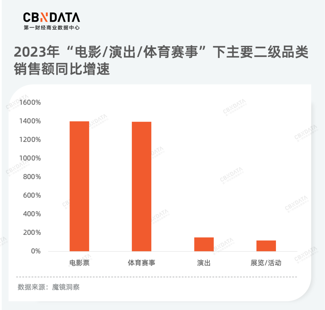 这些线下活动的热闹也引爆了货架电商平台的票务店铺。魔镜数据显示,越来越多消费开始通过平台旗舰店或专营店来购买电影票与体育赛事门票,去年二者销售额呈现井喷式爆发。此外,演出与展览/活动票务在销售方面也取得了巨大成功,实现了翻倍增长。值得一提的是,演出票务仍是消费者在货架电商购买的主要商品,贡献了2023年“电影/演出/体育赛事”品类超九成的销售额。