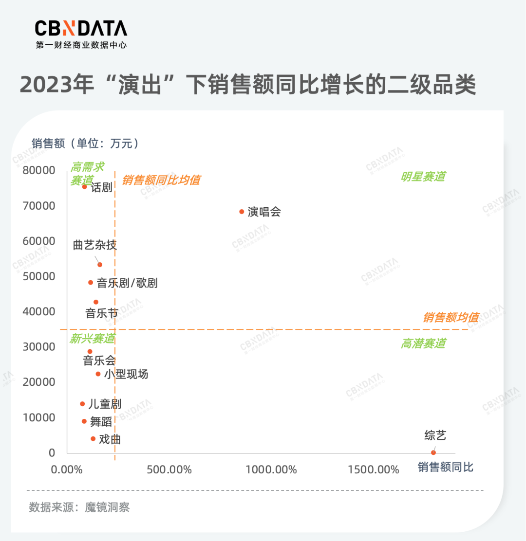 聚焦演出领域,CBNData研究发现,演唱会是2023年唯一一个在市场规模与销售额涨幅都表现尤为突出的二级品类。其中,周杰伦、薛之谦、五月天、张学友、张杰的演唱会门票贡献了七成市场份额。近年来,“躺平开摆”成了当下年轻人生活的信条,参与一场综艺和欣赏一出好剧都成为年轻人跳脱现实的方式。2023年综艺票务成为了增速最快的高潜力品类,而话剧、音乐剧等作为忙碌后的乌托邦,也出现了不同程度的上涨。