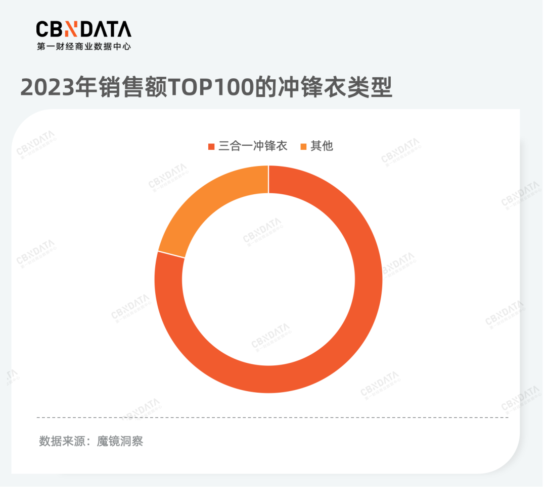 2023年,叶子品类“冲锋衣裤”表现尤为突出,凭借防水、防风、耐磨、透气、轻量等功能性受到消费者的青睐,销售额翻倍提升,是户外服装中最高潜的品类。场景方面,通勤是冲锋衣日常化重要的应用场景。根据CBNData发布的《23AW运动户外行业趋势白皮书》数据,在2023年社交媒体冲锋衣裤相关场景的笔记数与增速方面,日常通勤占比最多、涨幅最大。与此同时,由内胆和外套两部分组成的“三合一冲锋衣”(因为内胆和外套可以组成单穿内胆、单穿外套以及一起穿的三种穿法,所以叫三合一冲锋衣)逐渐成为日常穿搭的重要品类,去年销售额TOP100的商品中,近八成为三合一冲锋衣。