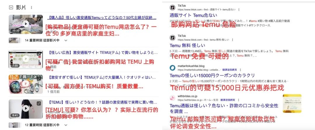倘若在Google日本搜索拼多多跨境电商平台Temu,一个直观的观察是,许多标题中都会提到一个日语单词「怪しい」。