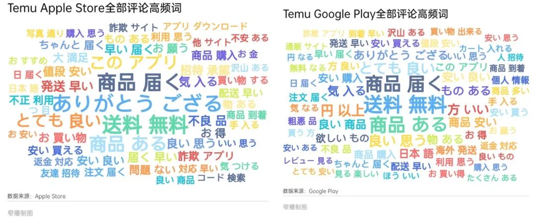 根据点点数据,我们制作了Temu在App Store与Google Play平台用户评论高频词词云图。