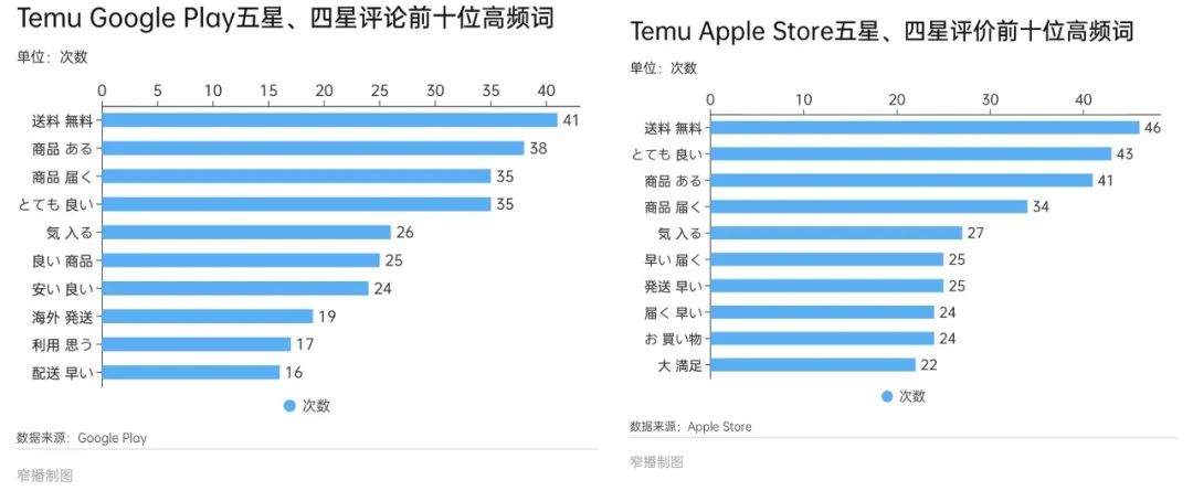 从Apple Store与Google Play双平台中的四星、五星高分评论中的关键词来看,「送料無料」都是高频关键词。