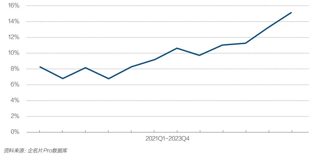 新设立的大型政府引导基金纷纷布局医疗行业。国资对大健康产业青睐已久,2023年找到了入场时机。2023年四季度,国资参与医疗行业一级市场融资次数占比,由2021年一季度的8.29%升至15.13%,将近翻了一番。