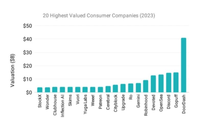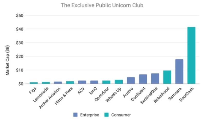 2、to C独角兽总估值从80%到20% 。如今最具价值的消费互联网初创公司在运营最后一英里送货业务 (DoorDash, Gopuff)、大健康 (Devoted, Ro, Cityblock) 和游戏驱动平台 (Discord, Rec Room) 等领域——这些公司在疫情期间创造了新的消费习惯。