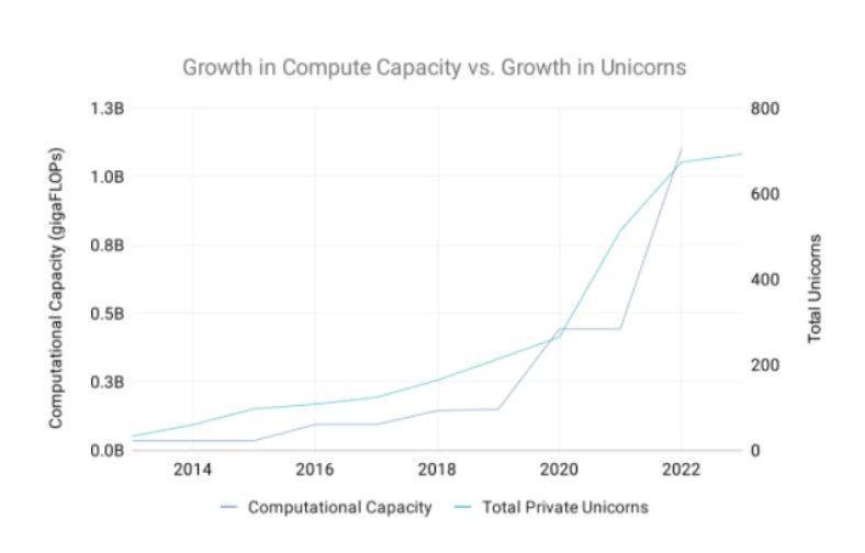 2、我们看到了摩尔定律的影子:随着计算能力、功能和使用的增加,独角兽的数量也在增加——在过去十年,受到企业软件支出、消费科技采纳、风险资本投资和利率的推动,独角兽数量平均每年增长了30%。