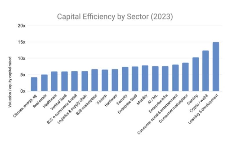 3、平均资本效率最低的行业类别包括:气候/能源、医疗健康以及Fintech。