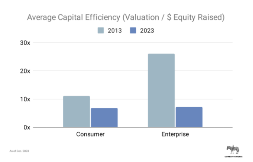 十年间,to B类企业,资本效率从26x——7x;to C类企业,资本效率从11x——7x。而且,考虑到现在很多独角兽估值过高,7x都给高了。