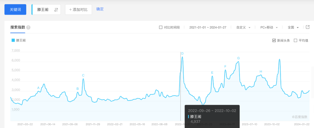 根据百度指数显示,自相关联动启动后,滕王阁的搜索指数在随后的国庆假期飞速飙升,达到峰值,并且在接下来的时间里实现了整体性的上涨。而根据官方人次数据显示,滕王阁的国庆入园人数恢复到了2021年的74%,超过9月全月,携程合作文旅路线GMV则达到1800万,增幅同比提升20%。