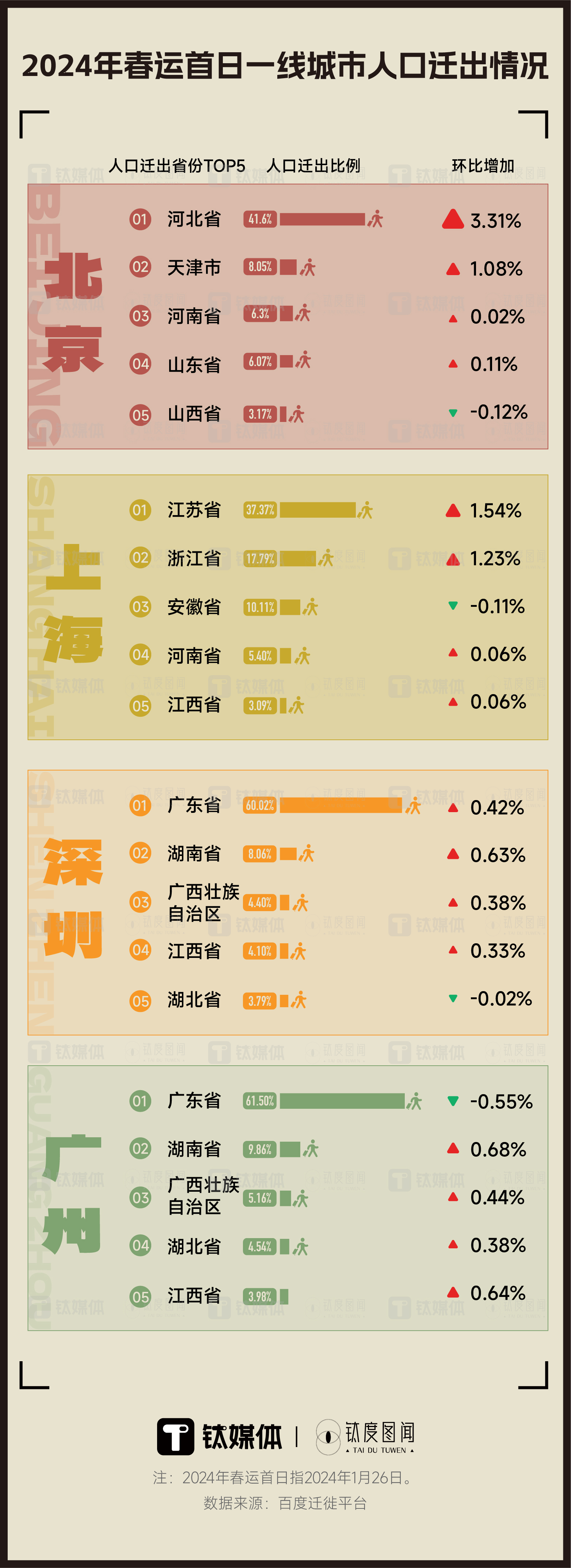 据钛媒体·钛度图闻统计,以四座一线城市为例,春运首日的人口迁出省份TOP5比例环比基本实现增长。1月26日,从北京前往劳务大省河北的人口迁出比例环比增长3.31%;从上海前往江苏的人口迁出比例环比增长1.54%;广州、深圳前往湖南的人口迁出比例增长最多,均在0.6%以上。