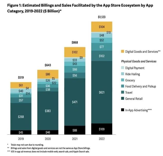 苹果在2023年5月31日援引Analysis Group的研究报告公布,App Store生态系统在2022年为开发者带来了1.1万亿美元的营收和销售额(见下图),其中来自数字商品和服务的收入为1040亿美元。根据30%的抽佣比例测算,苹果在当年抽取的“苹果税”在312亿美元。![]()