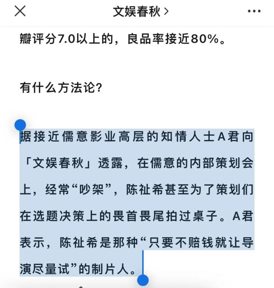 尽管宣布辞任儒意执行总裁,没有人会把陈祉希和儒意分开看待。从一家普通的影视公司发展至今,儒意资本运作能力是关键,但资本市场的主角却并不是陈祉希,她的战场实际上也在舆论场,在每个关键的节点时期,打下最精彩的票房胜仗。