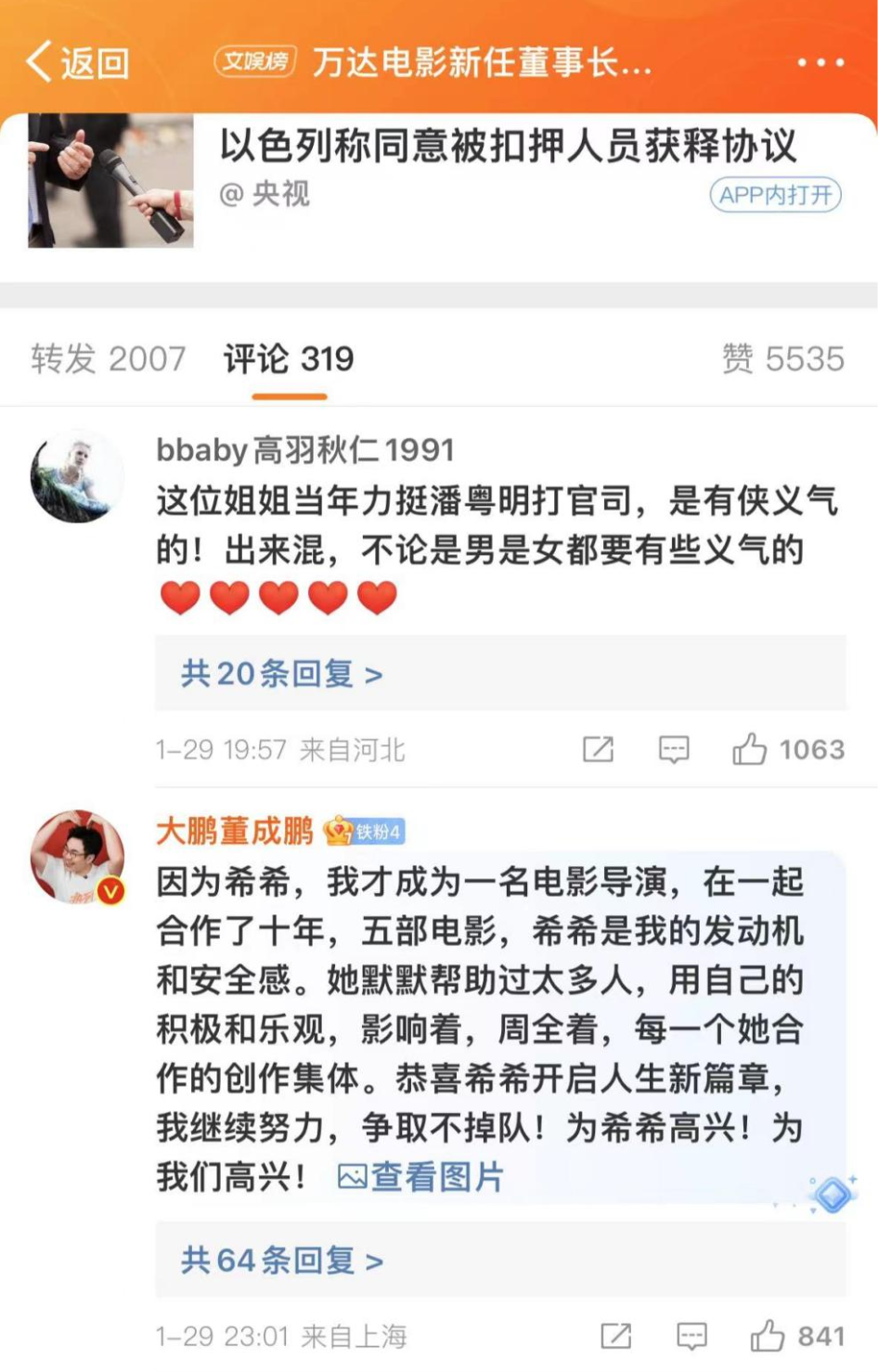 大鹏和陈祉希也保持着密切友好的关系,在万达官宣董事长的热搜中,大鹏亲自发微博回复:“希希是我的发动机和安全感。”