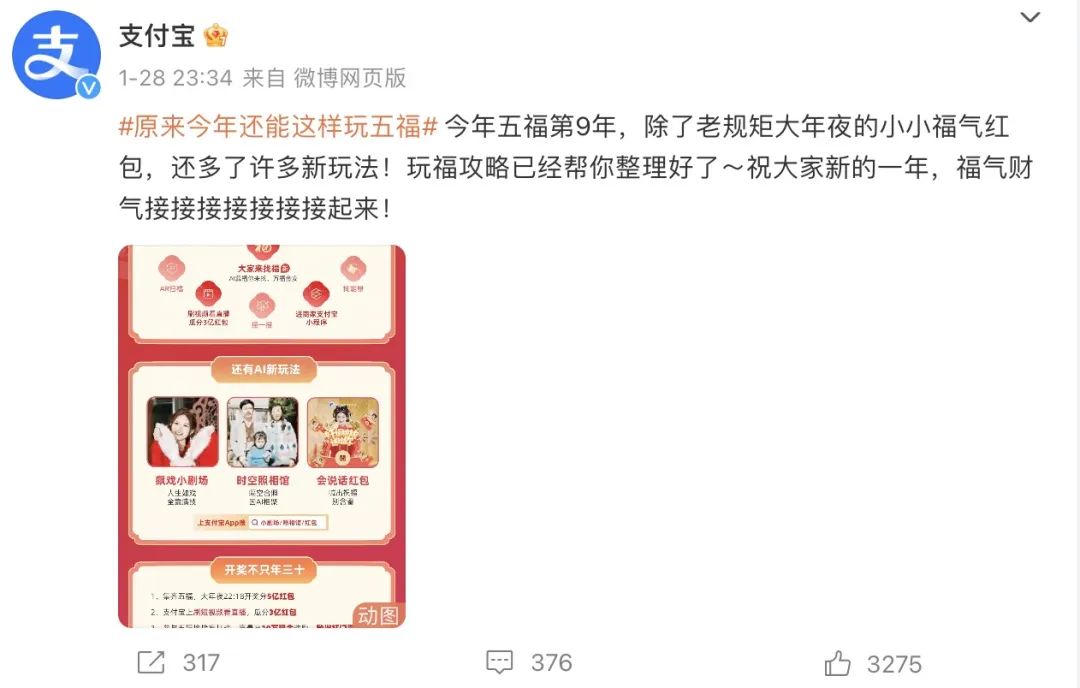 1月23日,支付宝公开了“集五福”的新玩法,相关话题还上了热搜。1月29日0点,“集五福”正式开启。