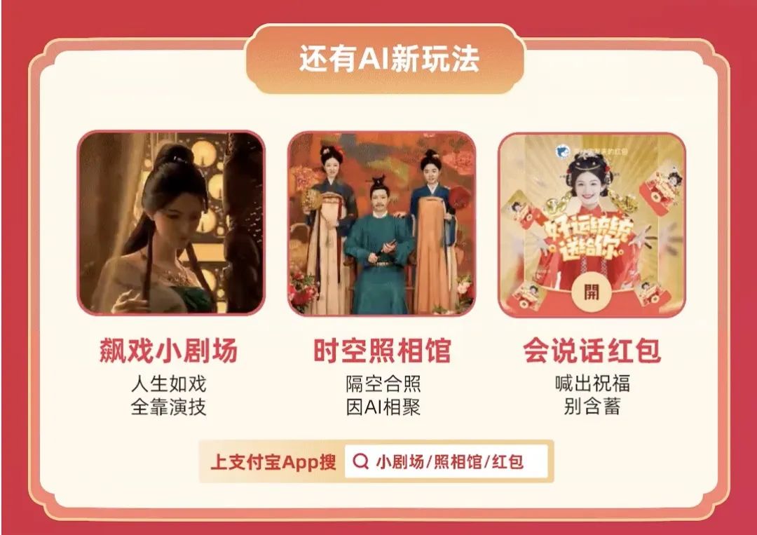 为了增加新意,2024年“集五福”还将借助AI技术,新增“飙戏小剧场”、“会说话的红包”、“时空照相馆”和“大家来找福”四个AI互动节目。