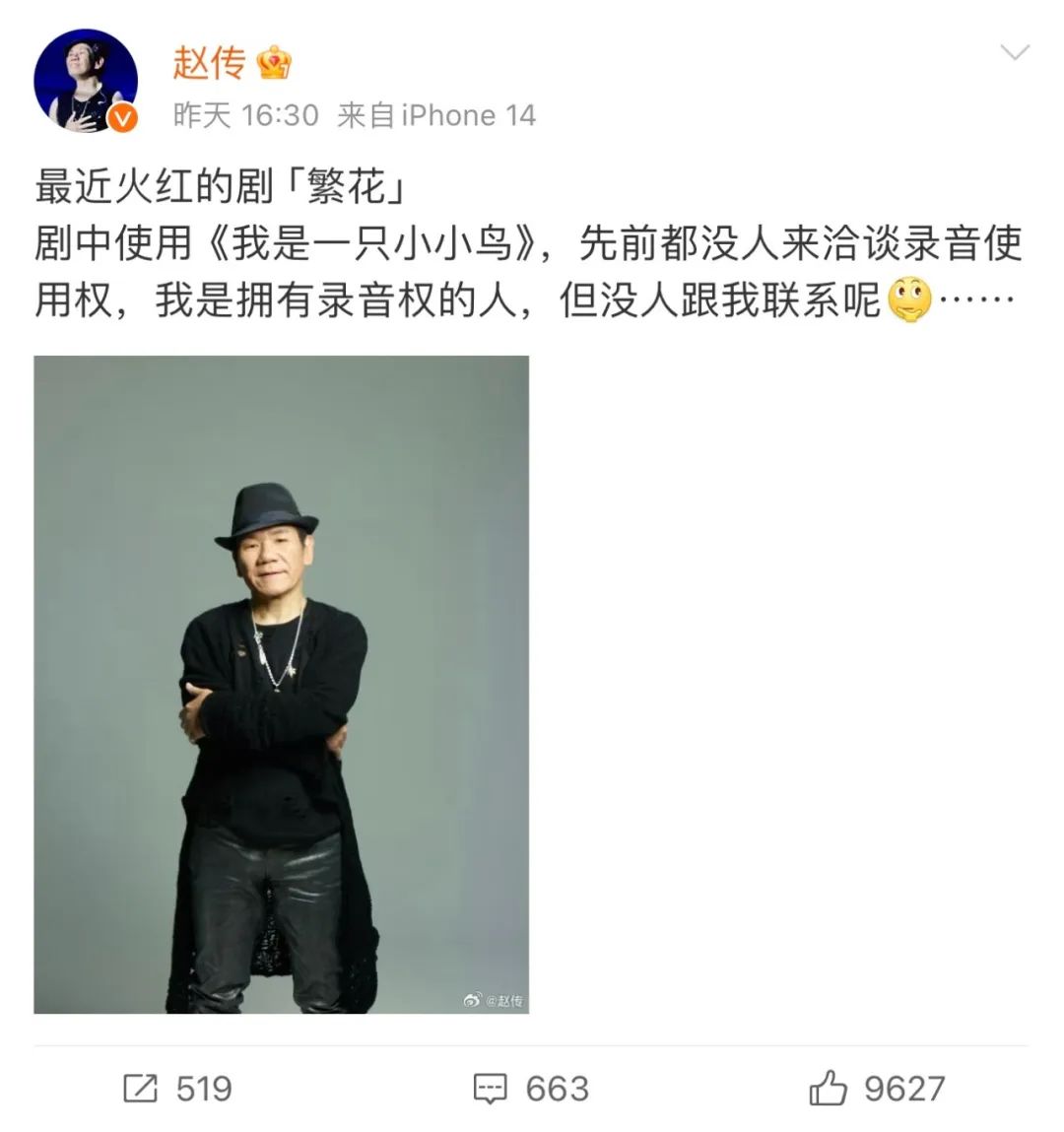 1月29日下午,歌手赵传发微博称:“《繁花》剧中使用《我是一只小小鸟》,先前都没人来洽谈录音使用权,我是拥有录音权的人,但没人跟我联系呢。”