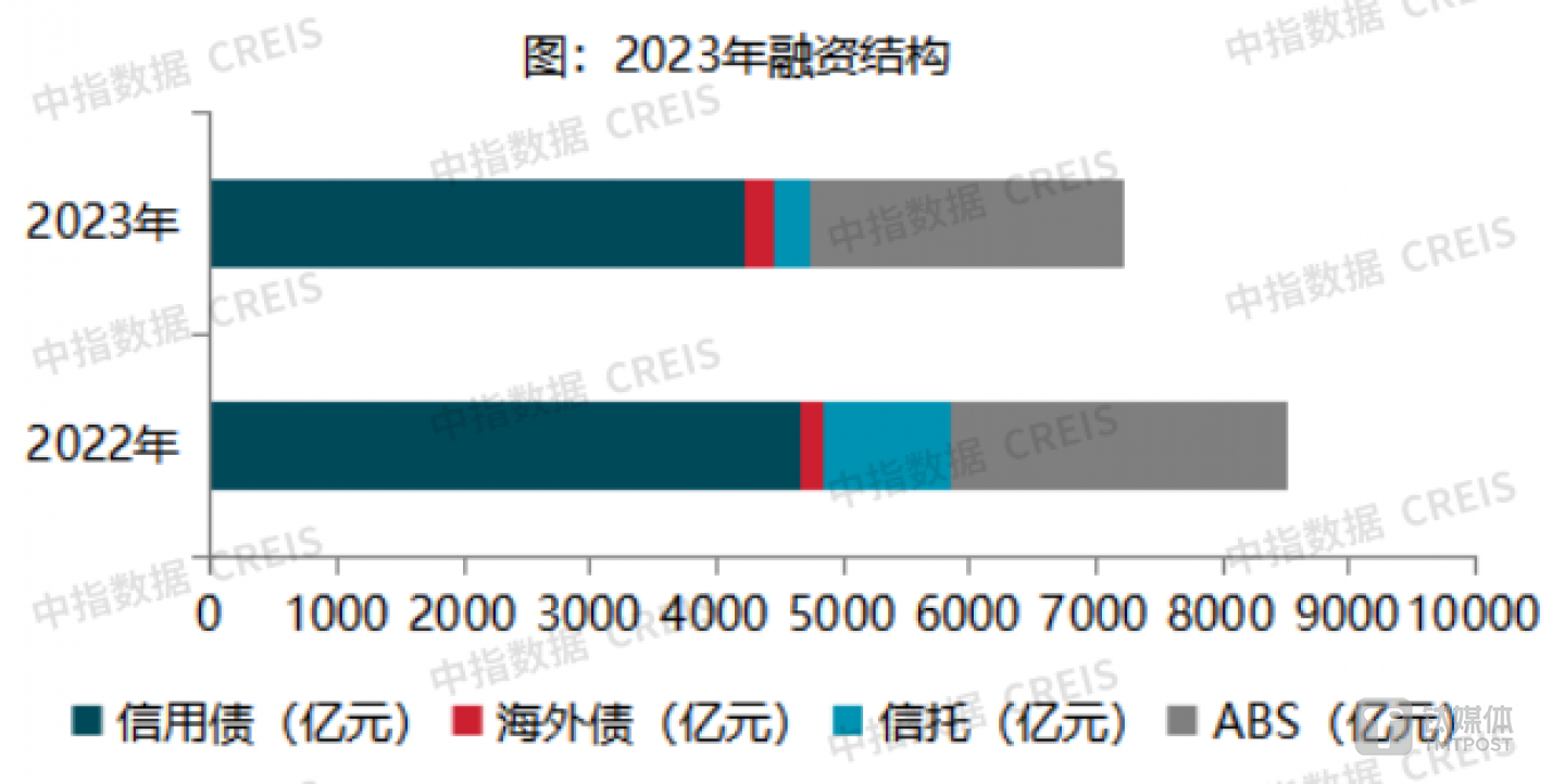 实际上,自“金融16条”以来,银行集中对房企授信,并未有效改善房企融资。据中指研究院发布的数据显示,2023年,房企融资政策虽然出现边际改善,但非银融资规模延续下降的态势。2023年行业共实现非银类融资7222.7亿元,同比下降15.1%。其中,信托锐减,海外债保持低水平,信用债成为融资主力,ABS融资占比超三分之一。