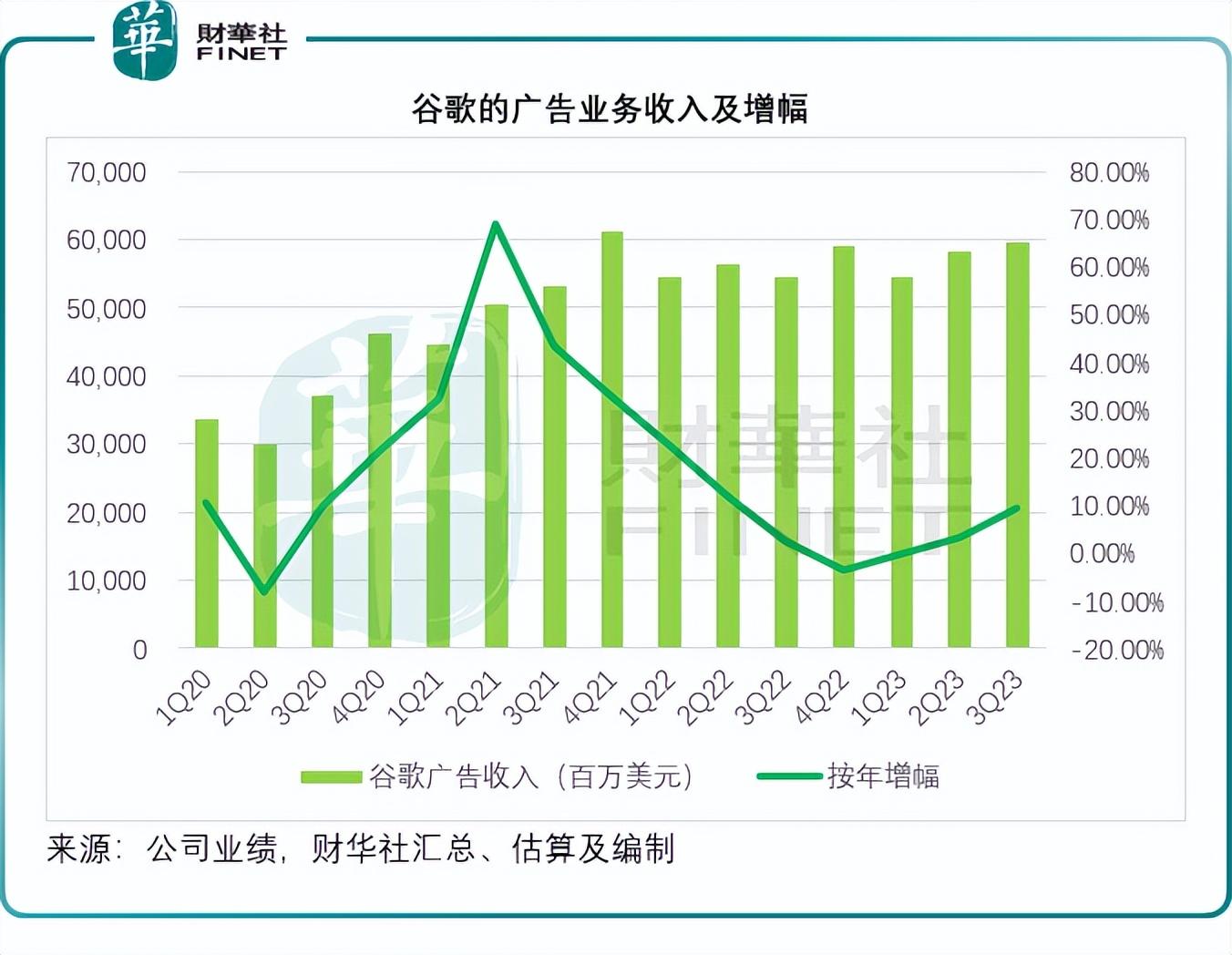 在2021年负利率带来的资本盛宴行将走向结束时,大家纷纷预期2022年美联储将展开加息周期,经济展望变得微妙起来,谷歌的广告营收也受到了影响,见下图,从2021年第3季起,谷歌的广告业务收入增长见顶回落,到2022年第4季跌至底部,从2023年开始轻微复苏。