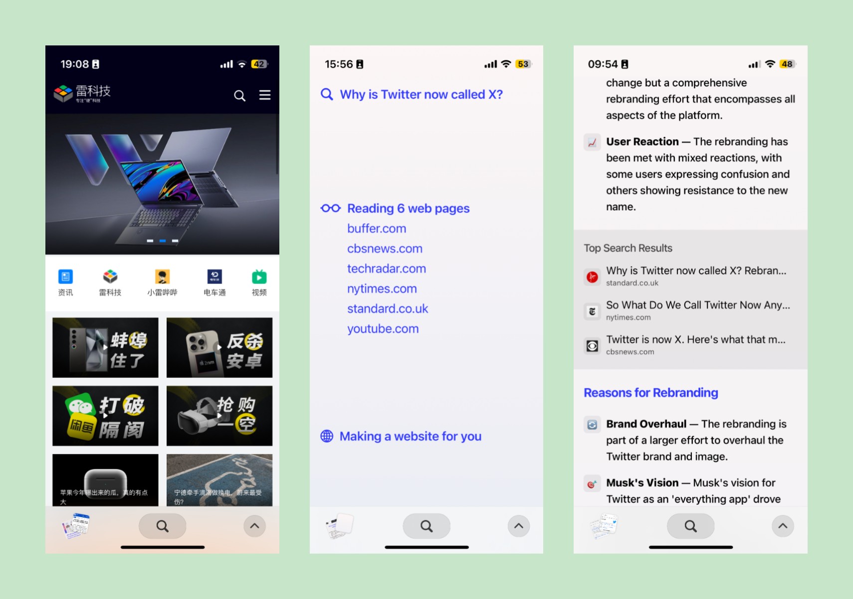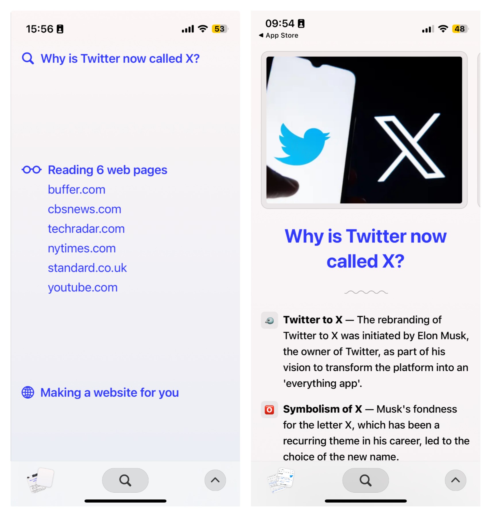 虽然有一些重复啰嗦的地方,但这个回答的质量完全可以满足大部分人的需求,AI 讲到了 Twitter 到 X 的各个层面的变化、背后的原因、后续的影响以及马斯克对「X」的偏爱等等。此外,AI 还会保留部分之前浏览网页,用户也可以自己点击进行浏览。