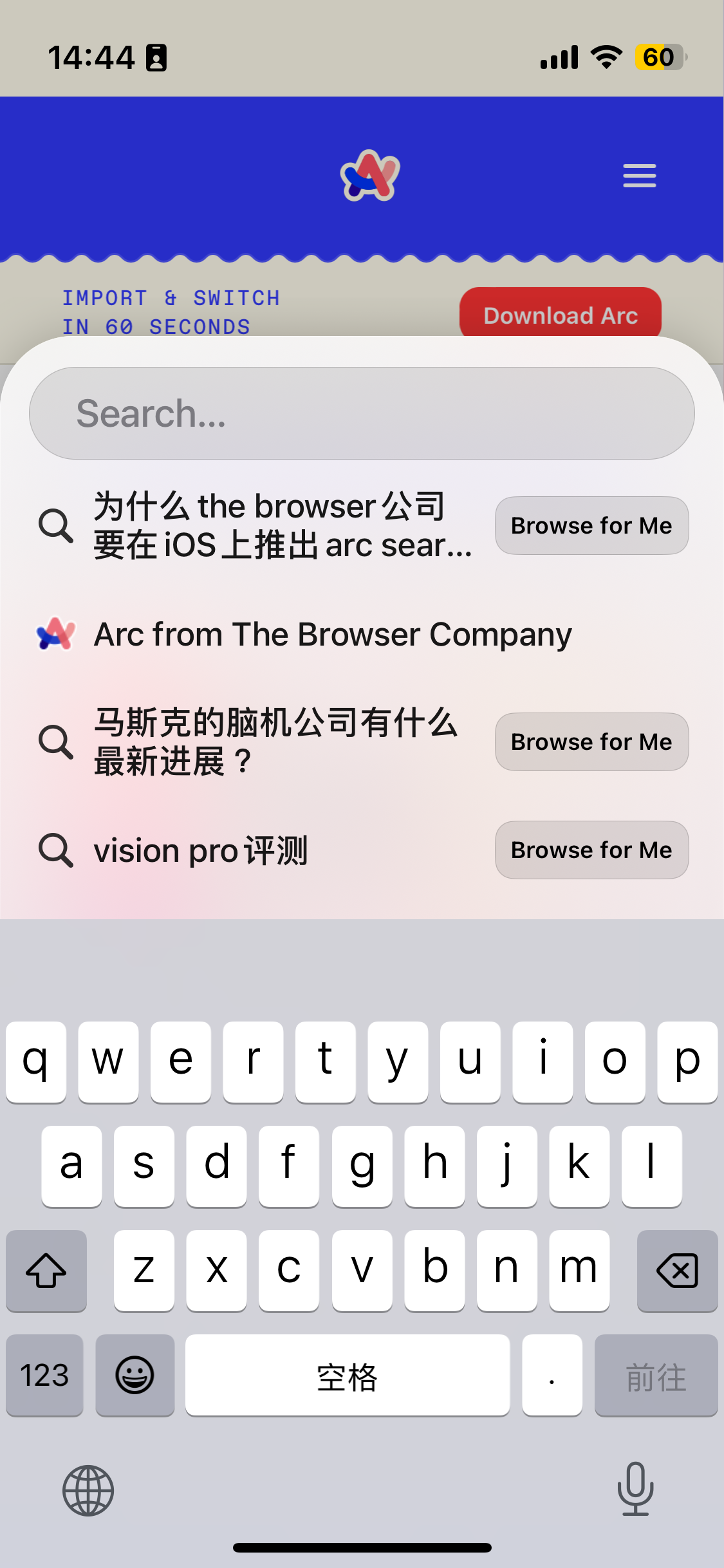 打开 Arc Search,应用会直接进入「搜索」模式并呼出键盘,减少一系列的「搜索」的前置步骤,也确实更符合「Search(搜索)」这个名字。