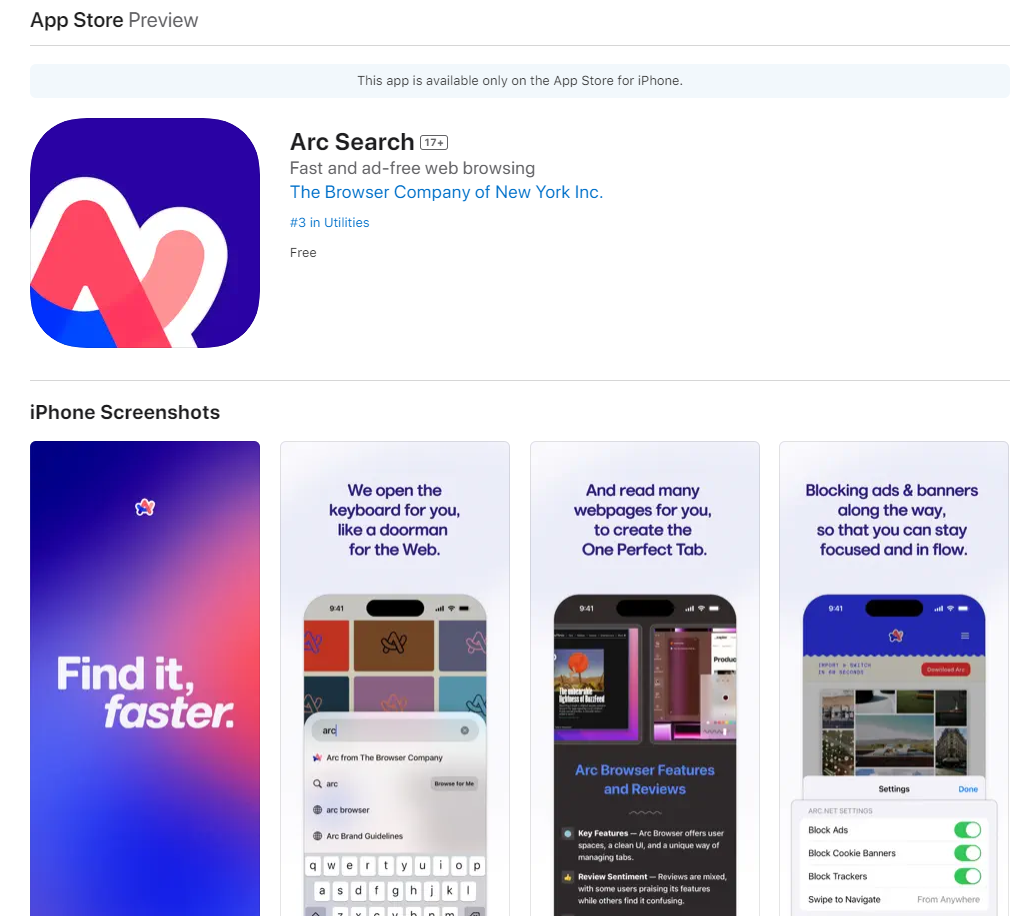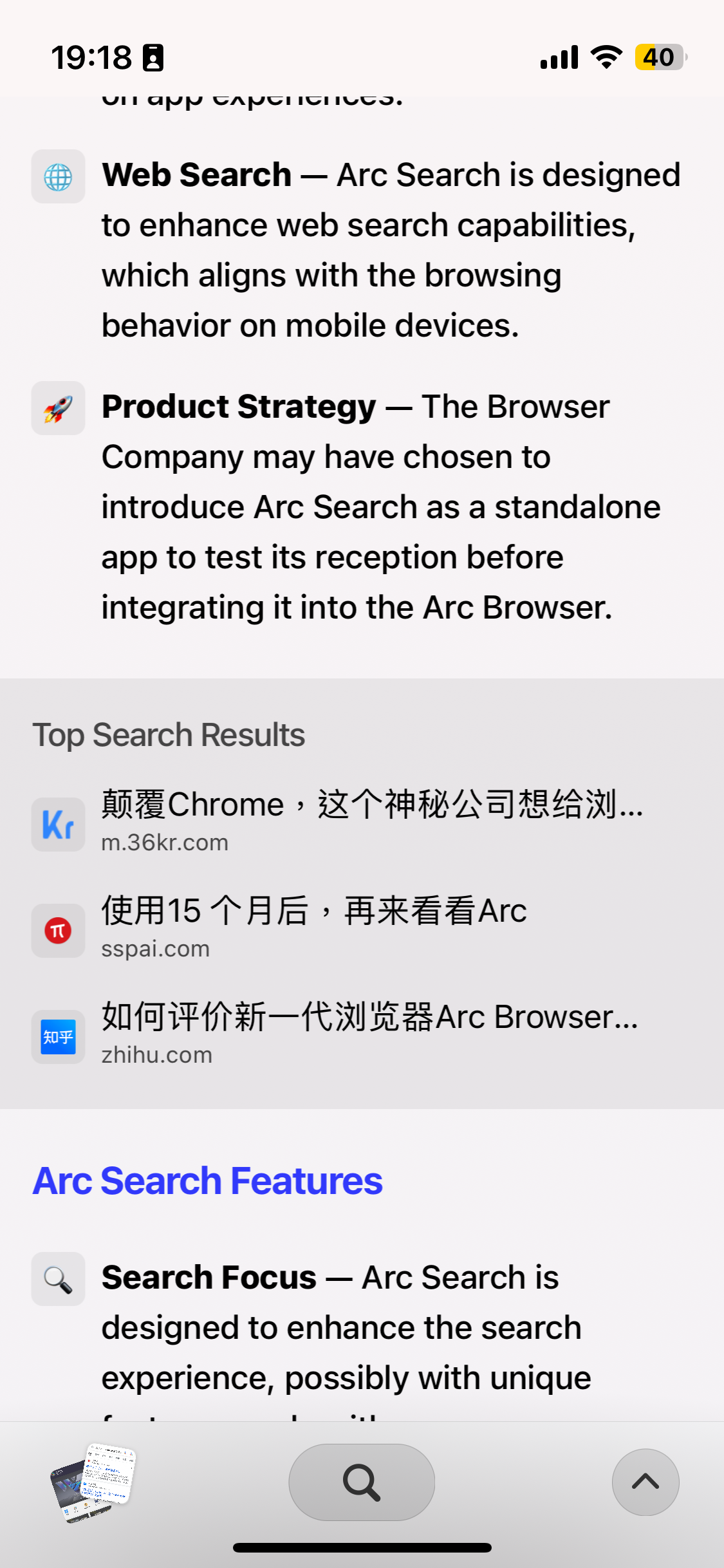 只看名字可能会以为这是个搜索应用,但本质上 Arc Search 还是一款移动平台上浏览器,根据官方公告,「Arc Search」将在移动平台上全面取代「Arc Browser」。而事实上,Arc Browser 在 2023 年 3 月才在 iOS 上发布了第一版,定位也是作为桌面版的配套应用。