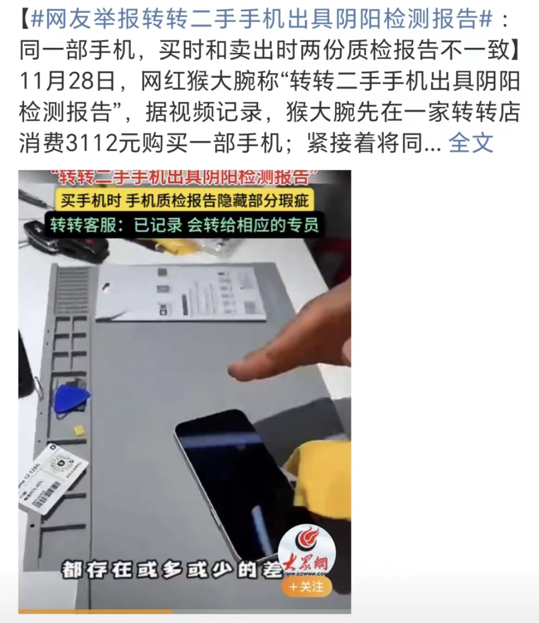 该网红在二手交易平台“转转”购机卖机过程中发现,销售时平台出具的质检报告显示手机没有问题,但同一部手机间隔不到半小时再通过转转回收时,却被查出“摄像头拍照有斑”“屏幕轻微划痕”等瑕疵,导致购入价和回收价出现较大差价。