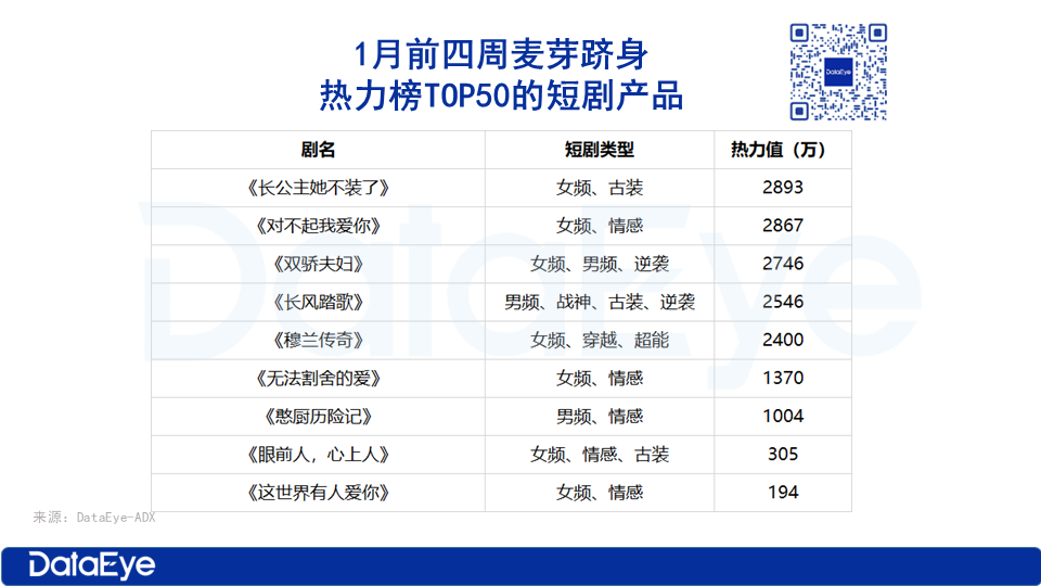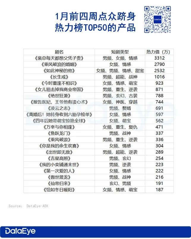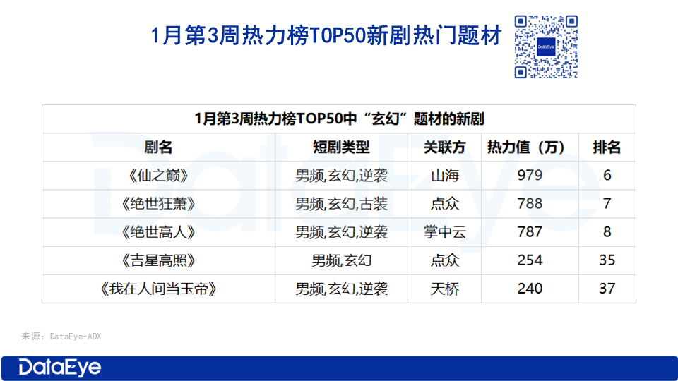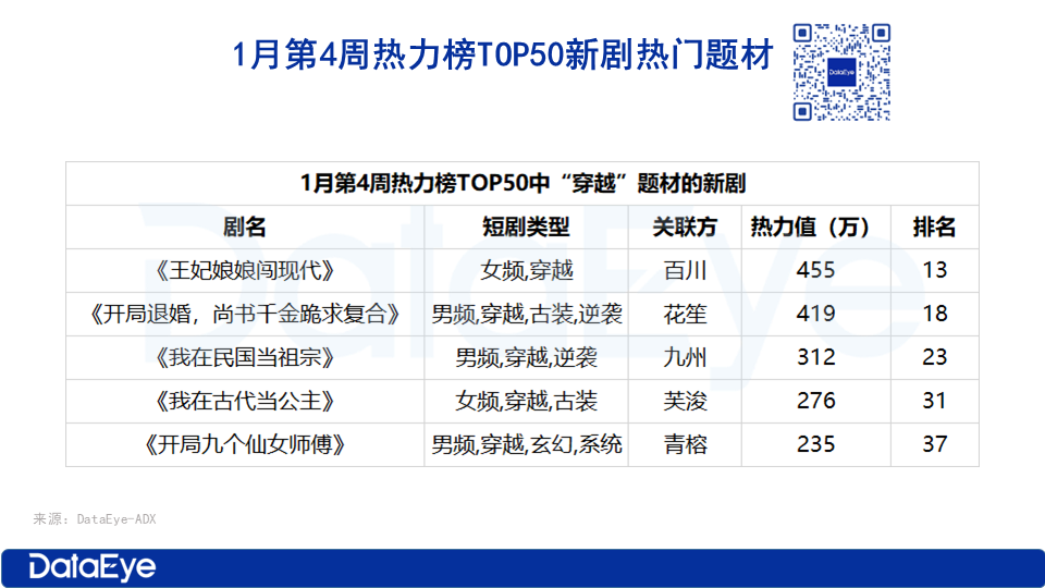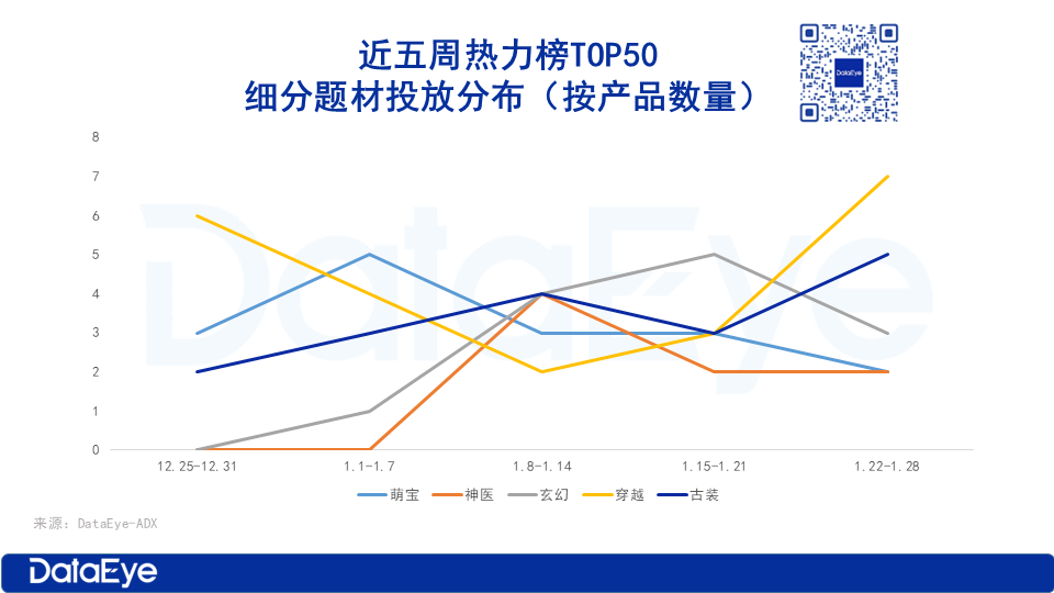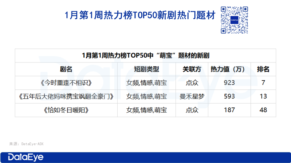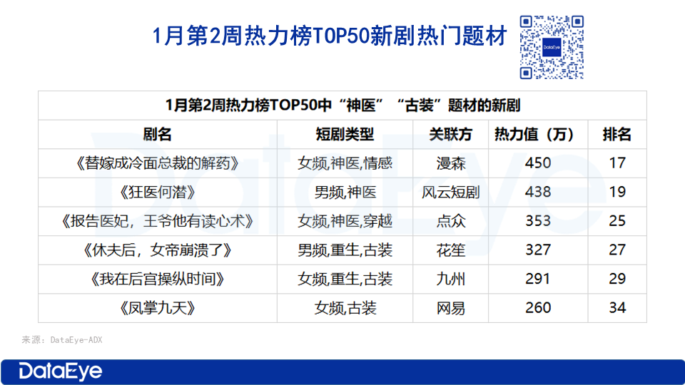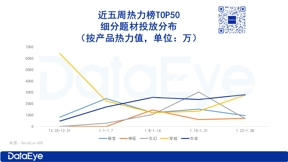 根据ADX短剧版,1月热力榜TOP50表现出色的新剧题材,1月第一周是萌宝,第二周则是神医和古装题材,第三周玄幻题材,第四周穿越题材。