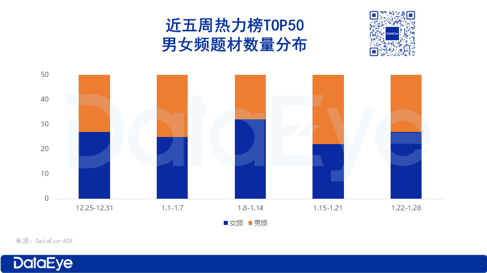 从产品数量来看,1月来,除了第三周,热力榜TOP50中女频题材的占比均超过男频题材。第三周,6部男频短剧闯入热力榜TOP10,同时当周24部新剧中有17部属于男频题材。
