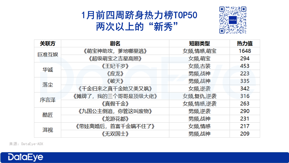 1月前四周,根据DataEye短剧观察统计,跻身热力榜TOP50 两次以上的“新秀”包括巨准互娱、序言泽、华诚、落尘、洱视、酷匠六家。