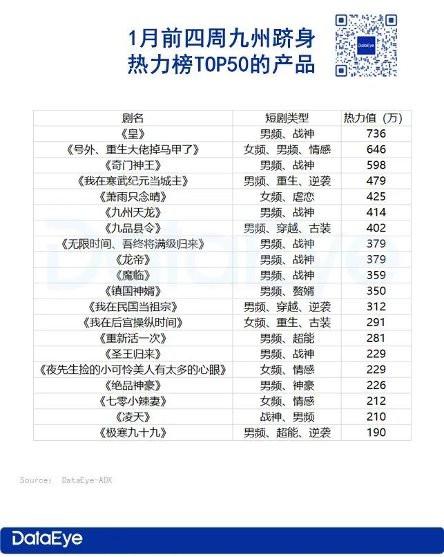 九州共有20部产品进入热力榜TOP50,单部短剧平均热力值360多万。